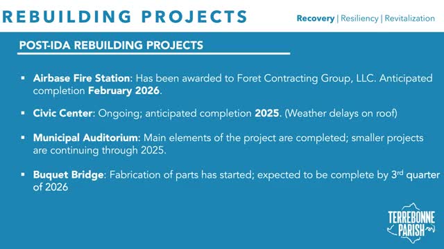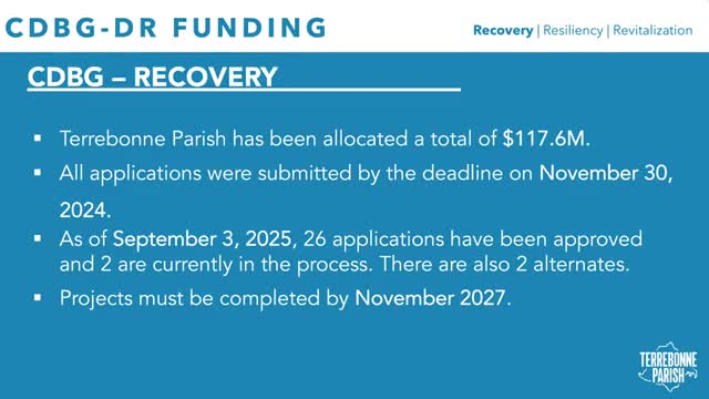 Parish outlines CDBG‑DR project list and studies; projects must meet HUD and state rules and 2027 deadlines