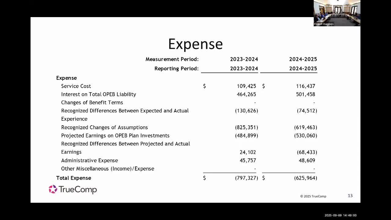 Finance committee reviews OPEB roll‑forward showing small net asset, cautions about sensitivity to discount and health‑cost assumptions