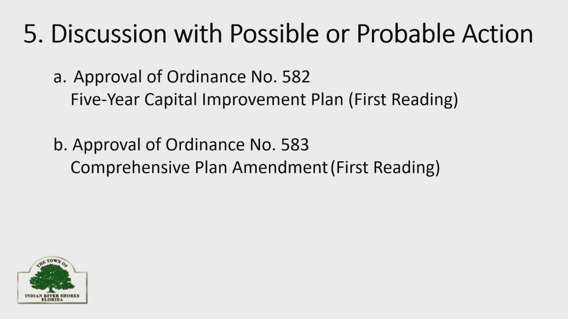 Indian River Shores council approves first reading of five‑year capital improvements plan ordinance