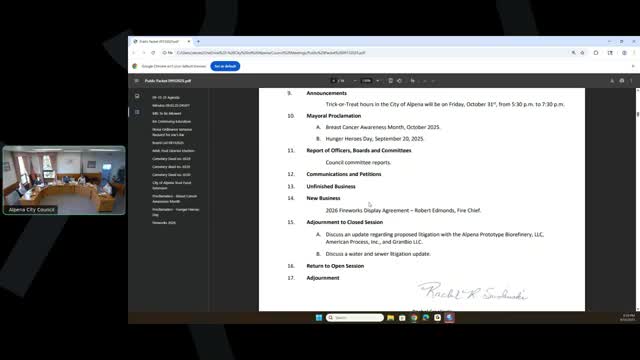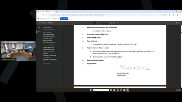 Alpena council adjourns to closed session to discuss proposed bio‑refinery and water/sewer litigation