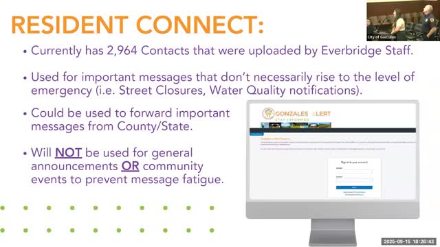 Gonzales council hears update on Everbridge and IPAWS emergency-notification setup; staff outline outreach needs