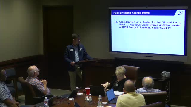 Commission reviews straightforward replat to split Lot 3 into two lots at Meadows Creek offices