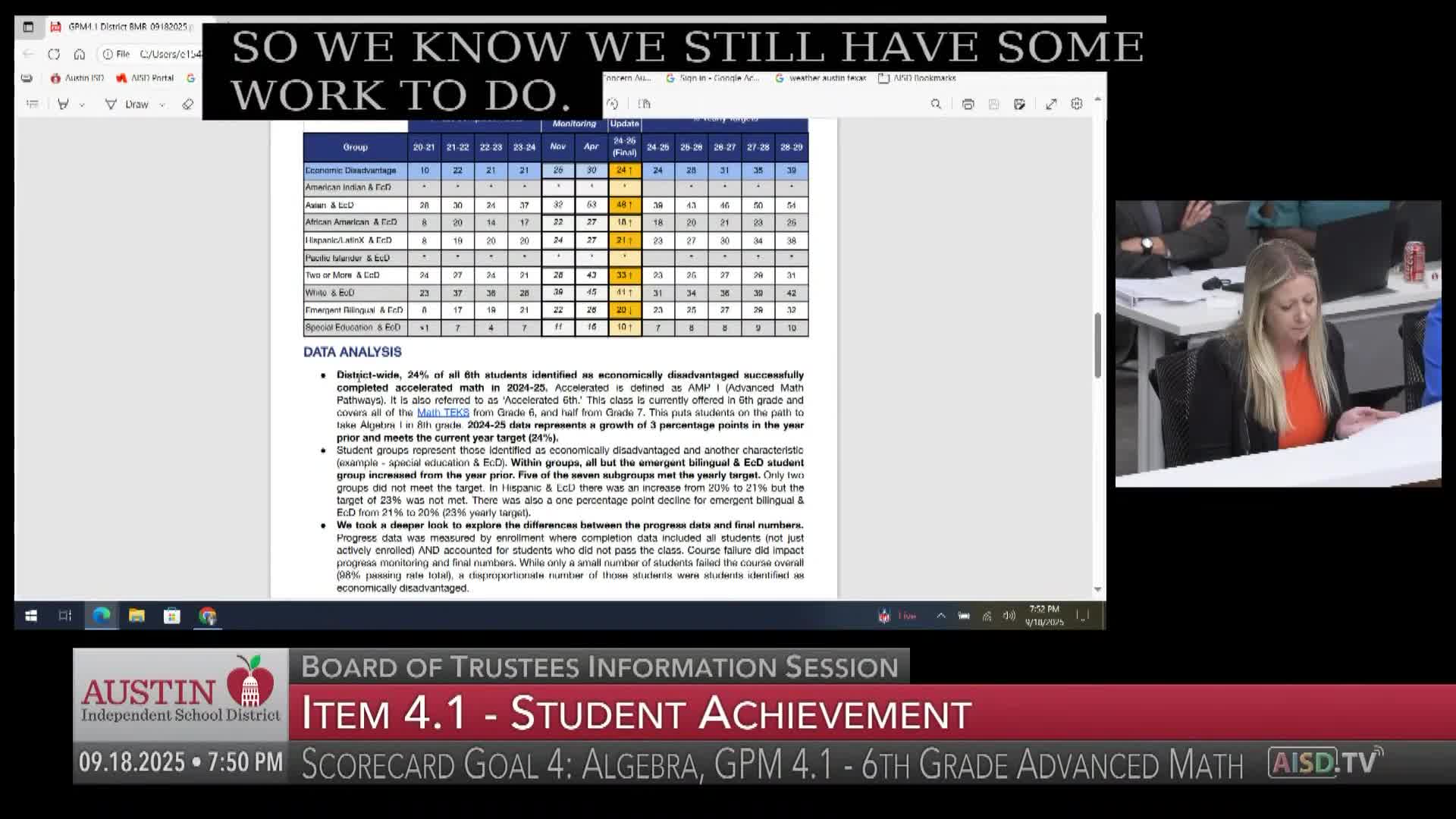 Trustees accept algebra monitoring report; district says middle‑school accelerated enrollment and completion rose to meet annual target