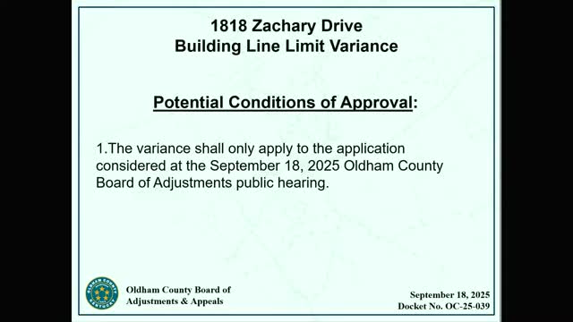 Board grants 15‑foot building‑line variance for 1818 Zachary Drive lot