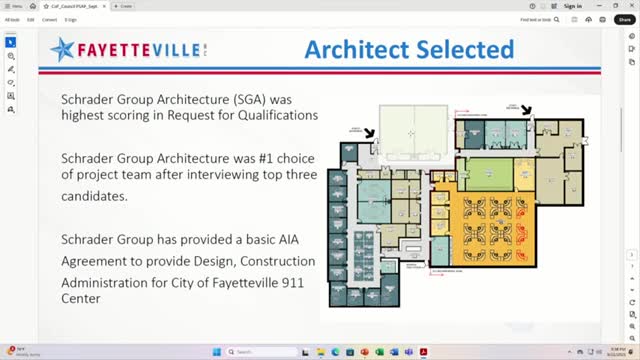 Council authorizes architect agreement for 9‑1‑1 public safety answering point design; consolidation with county to be discussed at work session