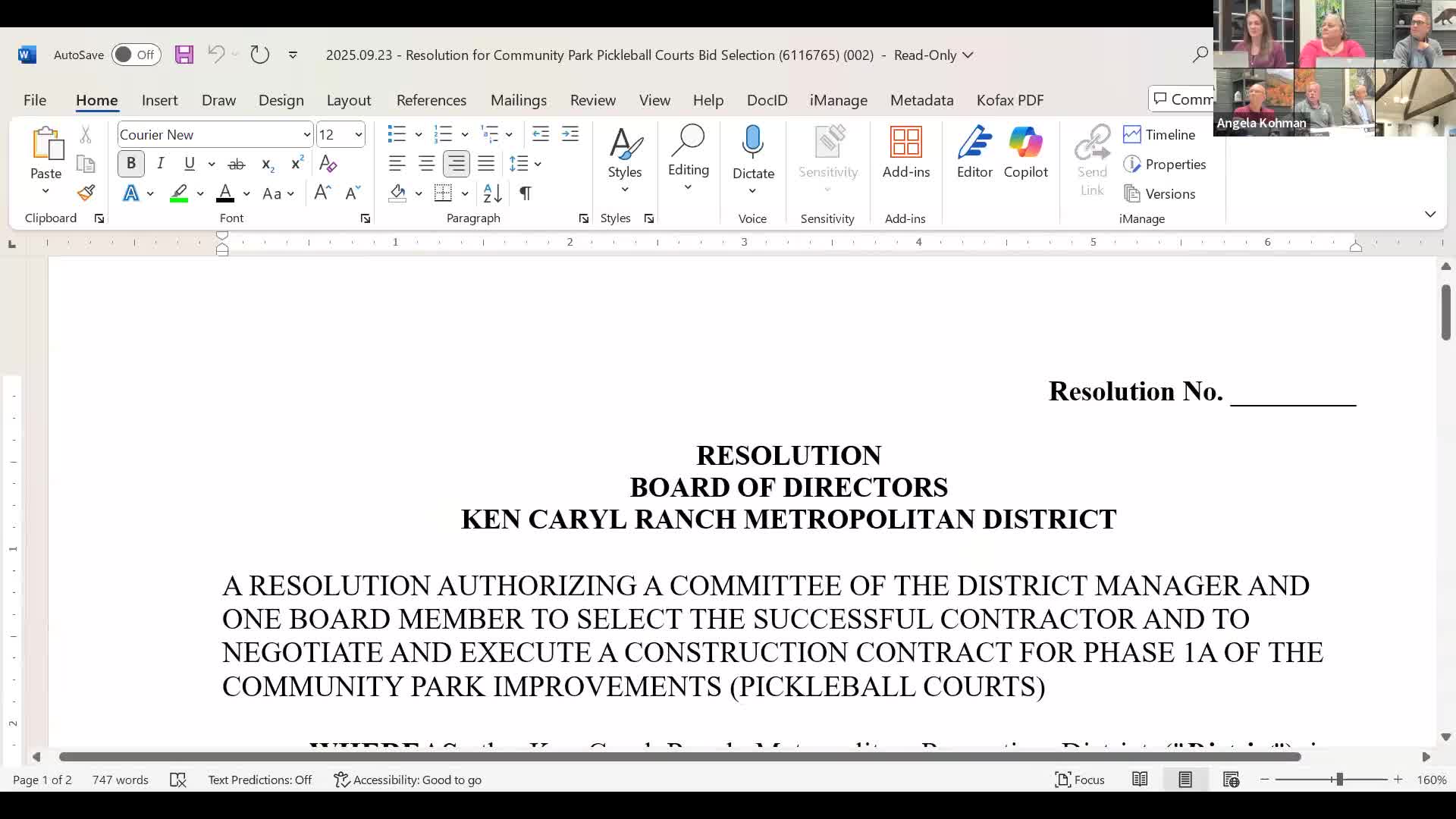 Board authorizes committee to review bids for Community Park phase 1A; waives policy for expedited award
