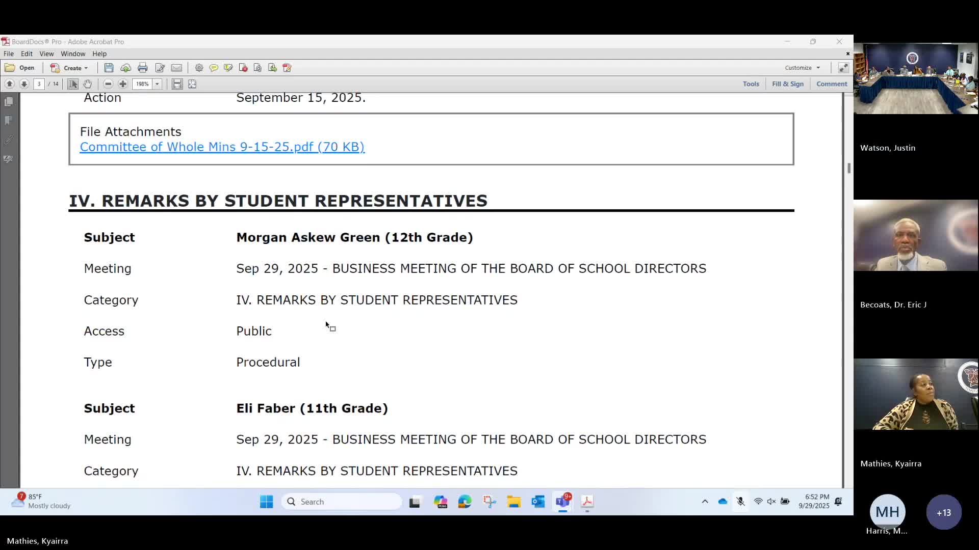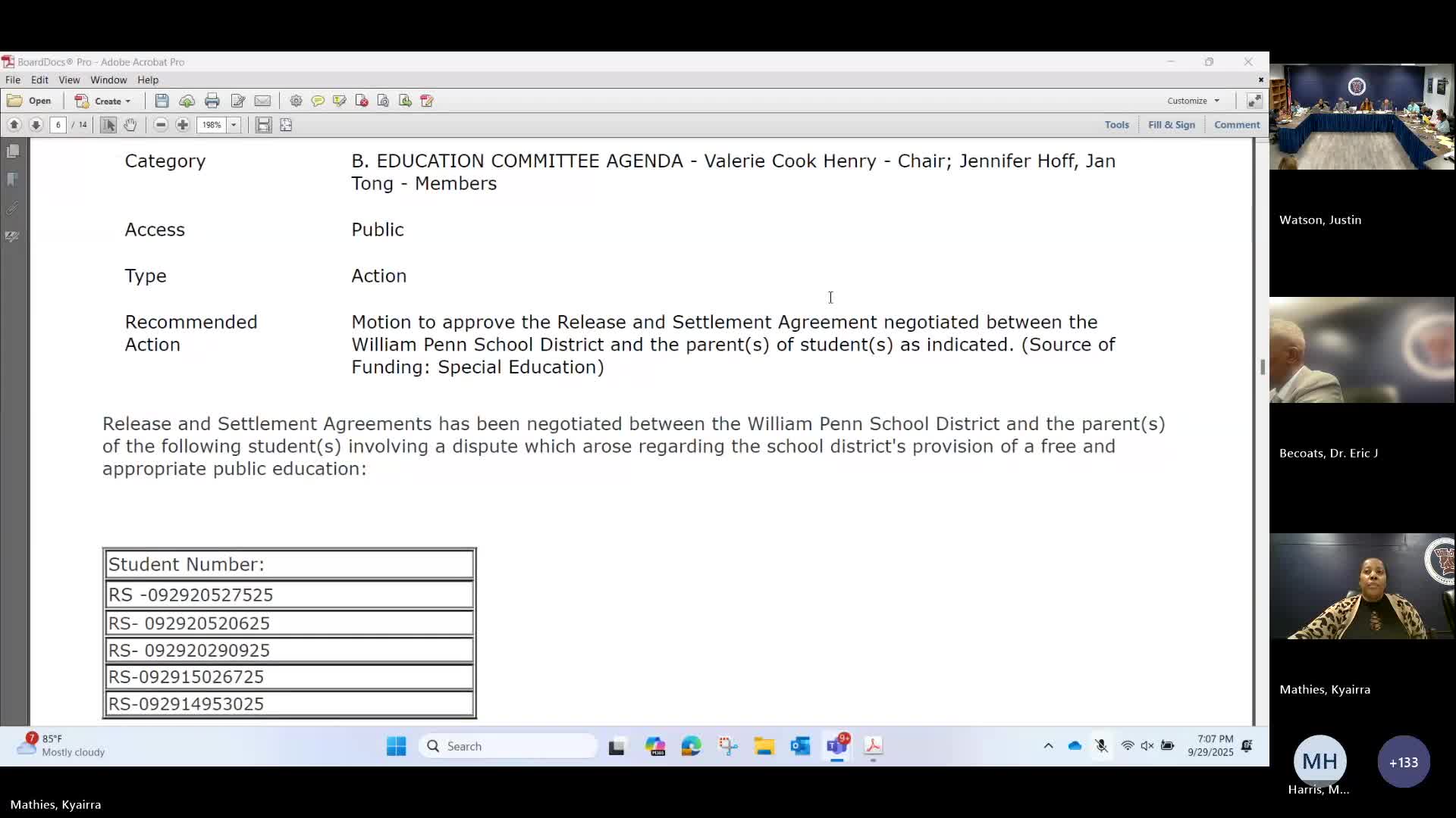 Board adopts 'Defend Our Students' resolution; approves MOU and settlement and records personnel and policy items