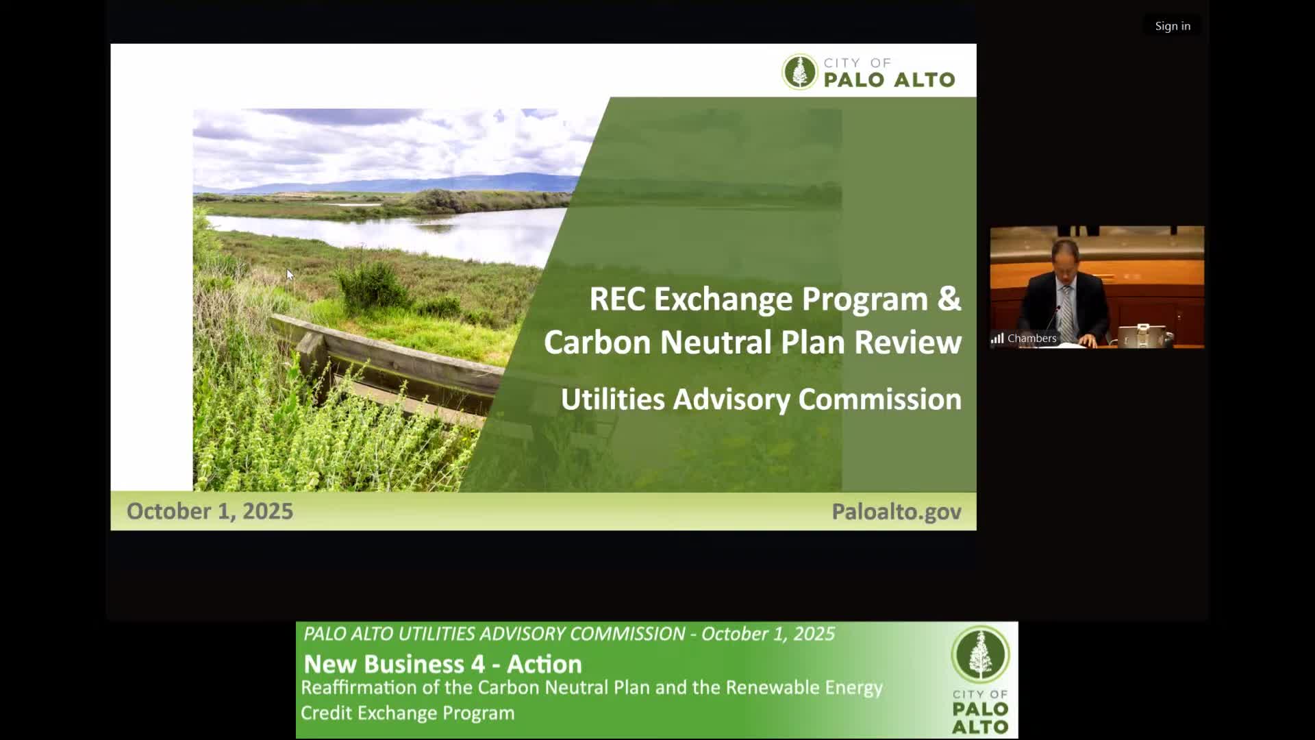 Commission reaffirms Palo Alto's carbon‑neutral accounting and renewable‑credit exchange program, votes 4‑0