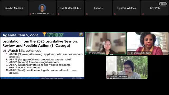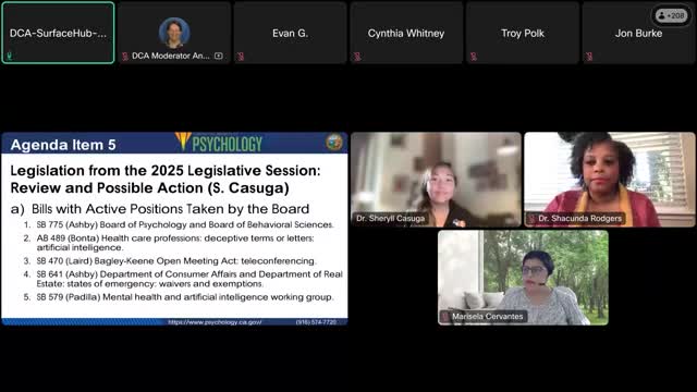 Board committee reviews 2025 legislation including SB 775 sunset, AB 489 on AI, SB 470 teleconferencing rules and SB 579 AI/mental‑health working group