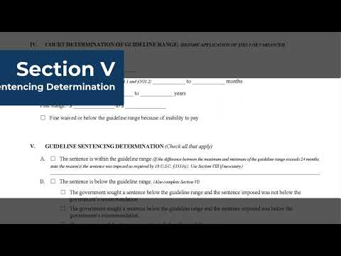 - Structure and sections: The form contains eight sections. The presenter reviewed each section and how courts should complete them: Section 1 (findings on the presentence investigation report), Section 2 (mandatory minimums), Section 3 (plea agreement determination), Section 4 (court determination of the guideline range), Section 5 (whether sentence is within, below or above the guideline range), Section 6 (reasons for sentences outside the range), Section 7 (restitution), and Section 8 (additional space for explanations).