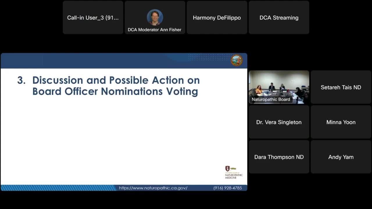 The California Board of Naturopathic Medicine held roll-call votes to appoint officers: Dara Thompson as president, Mina Yoon as vice president and Andy Yam as secretary; each vote was unanimous.