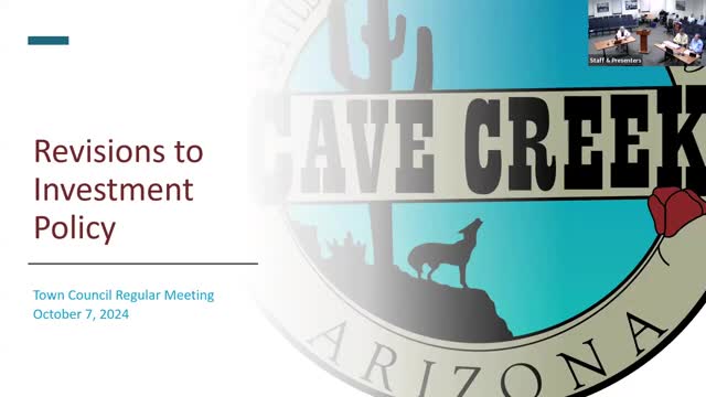 On Oct. 7 the Cave Creek Town Council approved two finance items: updated investment policy language (Resolution R2024-13) that expands authorized securities consistent with Arizona Revised Statutes, and authorization for the town manager to execute a master agreement with Wells Fargo Bank for banking and merchant services.