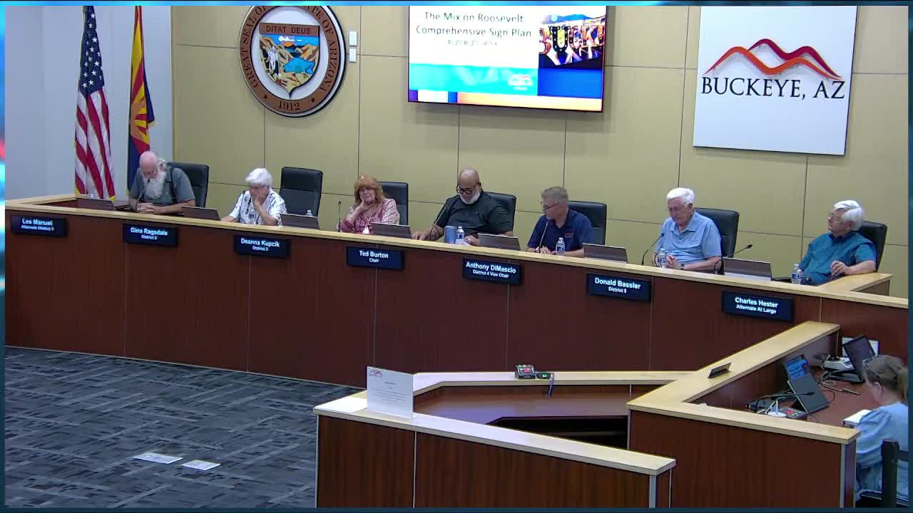 Bailey Pachinski, a planning intern, presented the proposal for the 12.75-acre site at the southeast corner of Roosevelt Street and Verrado Way, noting the development sits north of Buckeye Commons East and near a Costco warehouse. The plan calls for three 16-foot multi-tenant monument signs (two on Broadway and one on Roosevelt) and four 3-foot vehicular directional monuments. Pachinski said the sign heights and dimensions are consistent with existing code allowances; the number of freestanding signs is why the application came before the commission.