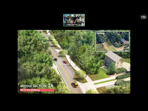 The consultants presented a short list of alternatives studied in depth and organized the corridor into three sections: north of Rutherford Road, a middle north–south connection (including North Main), and a southern gap to Wade Hampton Boulevard. For the northern section the team studied a Graves Drive option and a Renwick Drive option. For the middle section they evaluated routing along North Main Street (option 2a) and a Rutherford-to-Summit connection (option 2b). For North Main itself the consultants described four design treatments under consideration: a North Main Greenway, a two-way "Strollway," a neighborhood promenade in the median, and a side path on one side of the road. For the southern section the team compared a route using Gallivan Street and an alternative using Hillcrest/Parkwood connectors.
