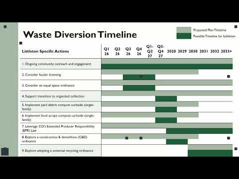 The Littleton City Environmental Stewardship Board on Wednesday reviewed staff’s timeline for the South Metro Waste Diversion Plan and discussed next steps including community outreach, hauler licensing and regional coordination.