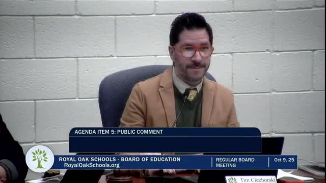 During public comment at the Oct. 9 Royal Oak Schools board meeting, Arroy Yaneka described ongoing bullying and inadequate special‑education supports for a student with autism and asked the board what concrete steps it would take to enforce district protections.