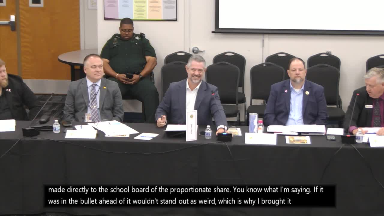 Context and next steps: County and school staff said they are coordinating with the MPO and county engineers on sidewalk and road improvements near problem campuses (see separate article on sidewalks). School and county staff said some design work is complete and that certain projects (for example, Spring Hill Elementary stacking loop) will proceed to bidding after outstanding plan approvals. No formal motions or votes were recorded on this item during the meeting.