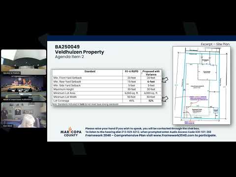 The Maricopa County Board of Adjustment voted 4-0 to approve five variances requested for the Rees property (BA250059) in Clearwater Hills to enable construction of a new single-family residence with limited additional disturbance to steep slopes.