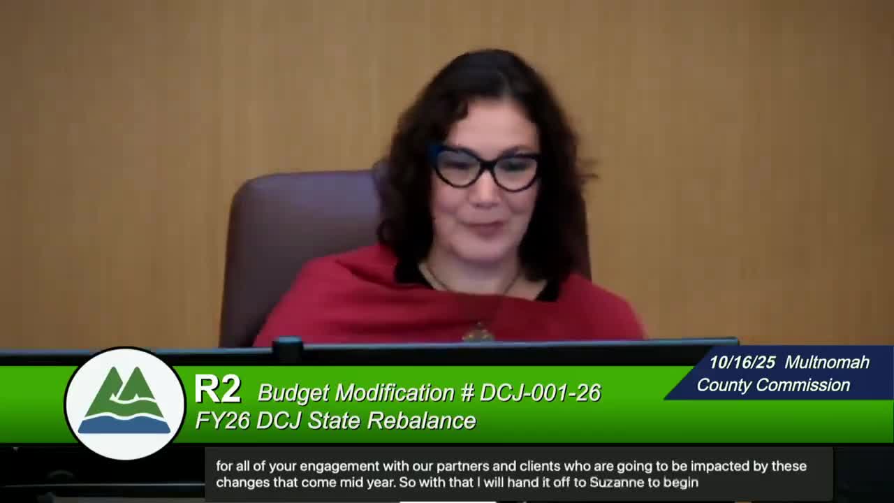 DCJ told the board it faces nearly $2 million in state funding losses and is bringing two budget modifications: a rebalance for a $1.9 million net reduction and a carry-forward of roughly $1 million from obligated FY25 grant funds. Commissioners pressed for data on community impacts and culturally specific providers.