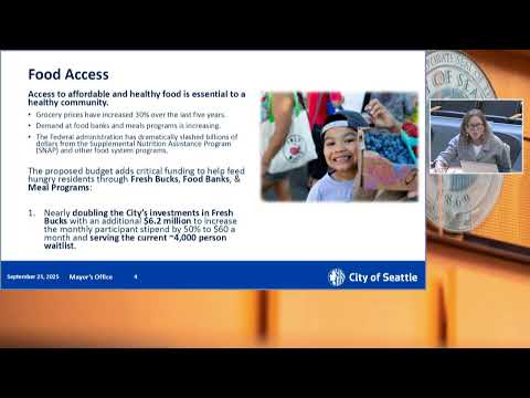 Seattle officials on Sept. 25 told the City Council’s Select Budget Committee they are proposing to use up to $30 million in proceeds from the proposed business-and-occupation (B&O) tax to protect local food access, housing and immigrant and refugee services from likely federal cuts. The proposal, presented by Deputy Mayor Greg Wong and department directors, would direct the money into three priority “buckets”: food access, housing and shelter services, and immigrant and refugee supports. Wong said the proposal is a risk assessment rather than a precise prediction of federal actions: “We are not dealing with a, necessarily logical or coherent federal government at this time.” The funding matters because city leaders say federal proposals and agency actions could sharply reduce assistance that many Seattle residents rely on. The executive’s package would expand the Fresh Bucks program, increase funds for food banks and prepared-meal programs, add emergency rental assistance and a reserve for shelter, and enlarge legal and workforce supports for immigrant and refugee communities. Deputy Mayor Greg Wong framed the work as a near-term mitigation strategy tied to the Seattle Shield Initiative, the B&O-tax-funded program the council forwarded to voters. He told the committee the third B&O “bucket” could provide “up to $30,000,000 in proceeds that may be used to mitigate the impact of federal funding decisions.” Office of Sustainability and Environment interim director Michelle Caulfield described the proposed Fresh Bucks changes: the program currently serves about 12,000 residents with a $40-per-month benefit and has a waitlist of more than 4,000 households. The mayor’s proposed budget would expand program capacity and raise the monthly benefit to $60. “Fresh Bucks reaches residents disproportionately burdened by poverty, food insecurity, and diet related chronic diseases,” Caulfield said, citing a University of Washington evaluation showing higher food security and fruit-and-vegetable consumption among Fresh Bucks participants. Human Services Department Director Tanya Kim detailed other food investments. The executive proposes a $3,000,000 addition for food banks and $1,000,000 for meal providers, bringing HSD’s food-and-nutrition portfolio to about $30,000,000 — a roughly 16% increase from the 2025 adopted budget, Kim said. She told the committee food banks now operate as community hubs offering mobile pantries, home deliveries and grocery access. On housing and shelter, Kim said the mayor’s package adds $4,000,000 for emergency rental assistance — bringing the city’s total rental-assistance capacity to $11,500,000 — and proposes a $9,000,000 appropriated reserve to allow rapid local backfill if federal shelter or Continuum of Care funding is reduced. Kim cited the King County Continuum of Care as an example of an award potentially at risk and noted the city has already filed legal challenges to some federal actions. Hamdi Mohammed, director of the Office of Immigrant and Refugee Affairs (OIRA), described threats to programs that support naturalization, legal representation for unaccompanied minors and other services. He told the committee the president’s 2026 budget proposal would eliminate the Community Development Block Grant (CDBG) program nationally and warned of cuts to legal-orientation and immigrant-defense funding. “We are seeing federal policy changes that are dismantling vital programs that serve our immigrant and refugee communities,” Mohammed said. Mohammed and budget staff said some local mitigation is already in place. The council previously approved a $300,000 midyear supplemental for immigrant legal defense and “know your rights” trainings; OIRA said $200,000 of that was put into a request-for-proposals (RFP) for legal defense and $100,000 for rights trainings. Mohammed noted OIRA’s ongoing base appropriation for legal defense is $1,300,000 annually, bringing the office’s current legal-defense funding this year to $1,600,000 with the supplemental. Council members pressed for more detail on who would be affected and how the city would allocate the funds. Councilmember Teresa Rivera asked why only $300,000 of the supplemental was directed to legal defense; Mohammed and Budget Director Dan Eder replied that the $300,000 was the supplemental for 2025, that $200,000 was RFP’d to legal defense immediately, and that the mayor’s 2026 proposal (roughly $3,700,000 for immigrant-related investments) would likely include a larger share for legal services after further community listening and a competitive process. Council members also asked for a clearer accounting of CDBG-exposed programs and which city services rely on those federal dollars. Deputy Mayor Wong and director-level staff said they would provide more detail to the committee on CDBG exposures and the proposed allocations. The presentation included several quantified clarifications: Fresh Bucks serves 12,000 households and has a 4,000-household waitlist; the executive proposes boosting the Fresh Bucks benefit from $40 to $60 per month; HSD’s food-and-nutrition portfolio would rise to approximately $30,000,000; the rental-assistance funding increase would bring the city’s total to $11,500,000 and the proposed emergency reserve is $9,000,000; OIRA reported current legal-defense funding at $1,300,000 plus a $300,000 supplemental, for $1,600,000 in 2025 pending 2026 allocations. Next steps: council members asked the executive to supply a breakdown of CDBG impacts and a fuller accounting of legal-defense funding sources and planned 2026 allocations. Officials said they will follow up with detailed spend plans and RFP timelines if the B&O tax passes and the backfill monies become available.