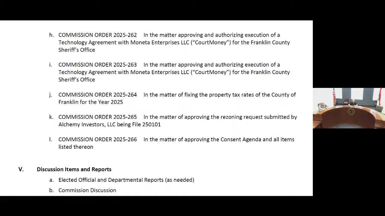 The Franklin County Commission approved commission order 2025-264 to set property tax rates for the 2025 tax year; the action was taken by motion, second and voice vote with no recorded debate.