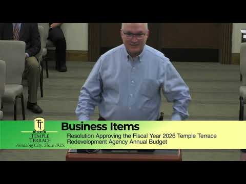 The Temple Terrace Redevelopment Agency unanimously adopted its fiscal year 2026 budget after a brief presentation and roll-call vote.