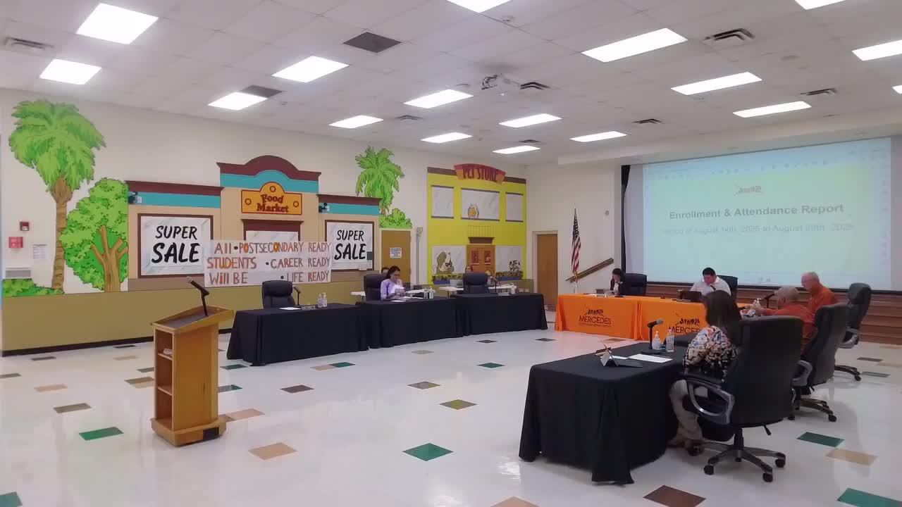 Mercedes Independent School District officials told trustees that district enrollment decreased by 281 students and average daily attendance fell during the first 13 days of the 2025–26 school year, with staff citing COVID-related illness and an active effort to locate missing students. The district’s technology director, Roland Handy, presented the first-day and 13-day counts for each campus and explained the difference between an exact enrollment count and the ADA measure. Superintendent Dr. Noyola told the board much of the early attendance decline reflected illnesses during the opening weeks and that outreach to families is ongoing. Handy opened the presentation by defining the reporting period: enrollment and attendance for Aug. 14–29, 2025, and he said district-level ADA fell by 287.28 and the attendance rate decreased by 0.94 percentage points compared with the same 13-day snapshot a year earlier. "This is not an average, but an exact count," Handy said of the 13-day enrollment column he displayed. The campus-level numbers the presentation showed included a 40-student decline at MEL (122 enrolled on Aug. 29, 2025, vs. 162 the prior year), a 116-student increase at Hinojosa (584 vs. 468) and a 65-student decline at Mercedes High School (840 vs. 905). The district also reported ADA and percentage changes for each campus; for example, Mercedes High’s ADA decreased by 76.72 and the attendance rate fell about 1.2 percentage points. Dr. Noyola said district staff have been conducting phone calls and home visits since school opened to locate and account for students and that the figures reported were an early snapshot: "the numbers that we'll discuss next month will be very different from here because we are tracking every student accounting for," he told trustees. He added that final accountability enrollment for state reporting will be determined on the last Friday in October. Board members asked about specific causes and the district’s follow-up. Trustees noted elementary attendance generally remained near the mid-90 percent range while middle- and high-school rates showed larger early declines. Dr. Noyola said the district’s health services and campus teams identified COVID as a major contributor to early absenteeism and that attendance has begun to rebound. The presentation concluded with board recognition of campus efforts to maintain attendance and a reminder from trustees that outreach and monitoring will continue through the October accountability date.