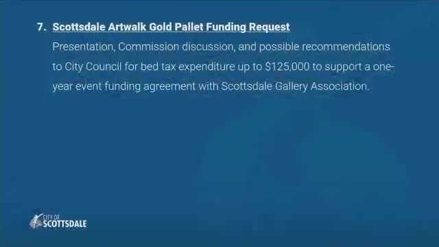 Scottsdale Gallery Association sought $125,000 to expand Gold Palette Art Walk digital advertising and programming; the Tourism Development Commission approved $75,000, the same level as the prior year, citing budget norms and staff guidance.
