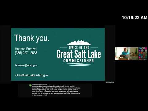 Grant and application details: Frias gave a funding announcement: "We have a $53,000,000 grant available, in partnership with the Great Salt Lake Watershed Enhancement Trust. That grant is currently open. We are accepting RFPs, and we will be accepting those until October 24." She urged applicants to contact the commissioner's office at greatsaltlake@utah.gov for questions and said staff and the Trust are available to provide application guidance.