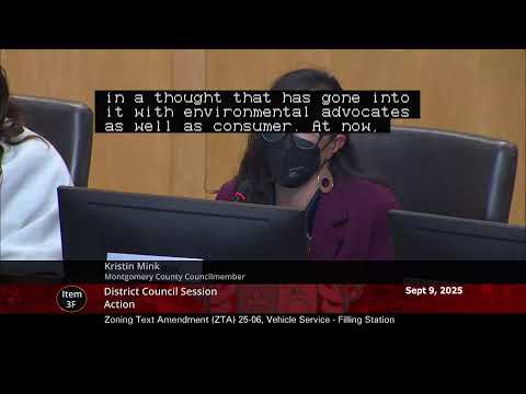 The Montgomery County Council approved Zoning Text Amendment 25-06 to clarify how the 500-foot setback for large filling stations is measured, following debate over whether the measurement should be taken from pumps or from property boundaries and discussion of impacts on the Viva White Oak development and a proposed Costco.
