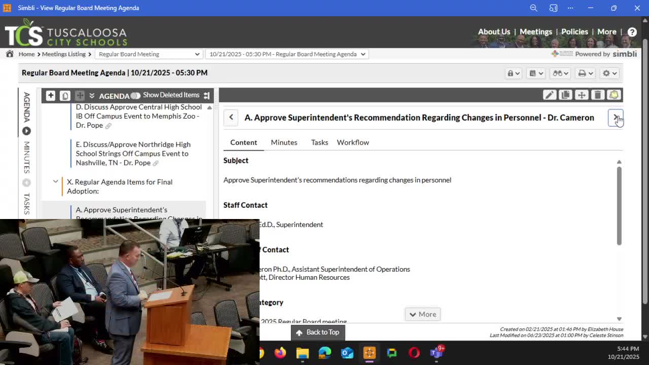 The Tuscaloosa City Schools Board of Education approved the superintendent’s personnel recommendations as part of the Oct. 21 consent agenda (items 9a–9e).
