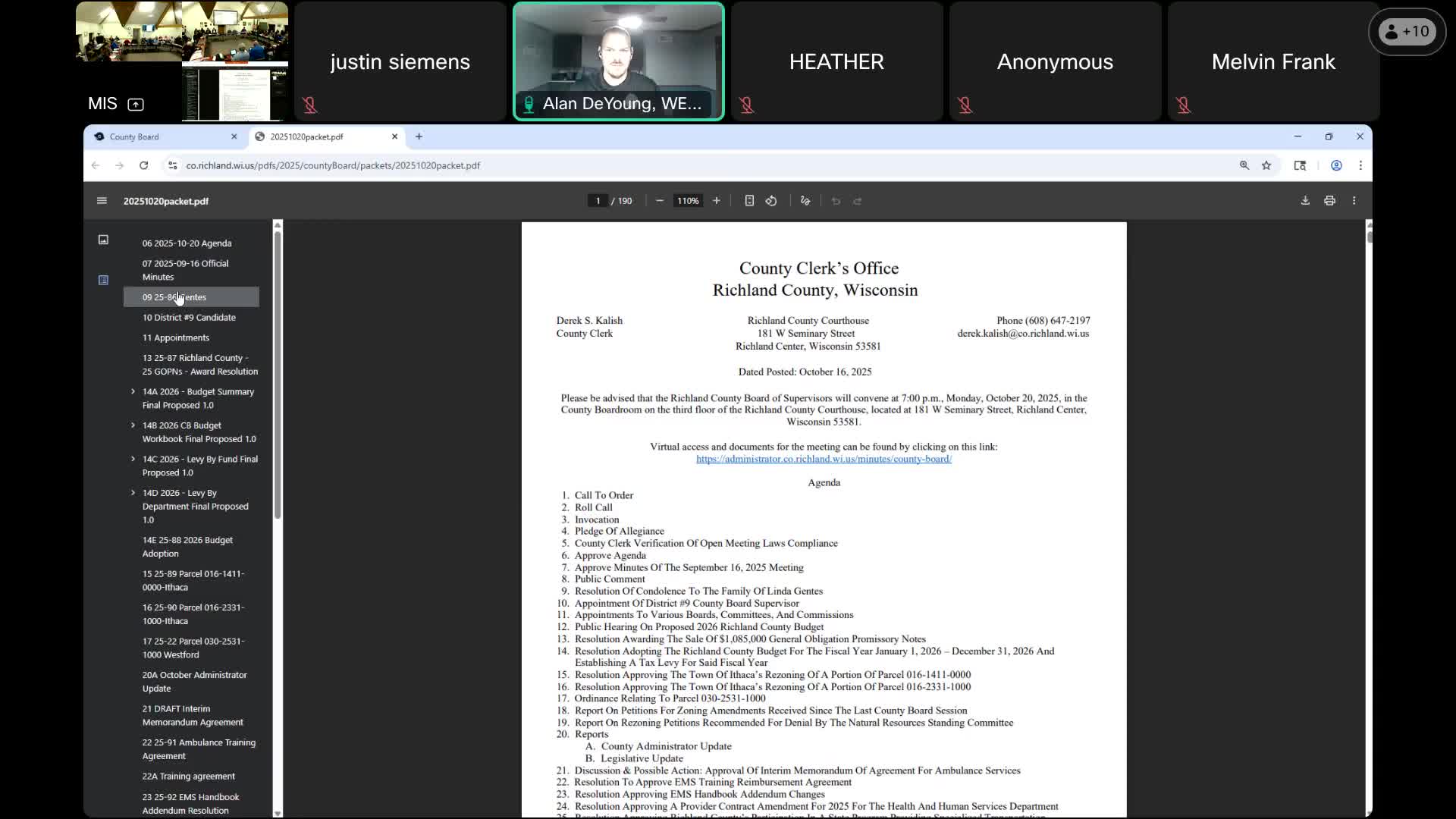 - The board approved a second amendment eliminating per‑call charges for the City of Richland Center for calls to county‑owned facilities and funded that change by moving about $4,000 from the parks budget. (Motion to amend: Supervisor Severson; second: unnamed. Voice vote: ayes prevailed.)