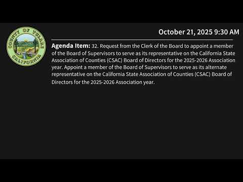 The Tulare County Board of Supervisors on Oct. 21 took routine actions including unanimous approval of the consent calendar and a separate unanimous appointment of the county representative and alternate to the California State Association of Counties (CSAC) Board of Directors for the 2025–26 association year.