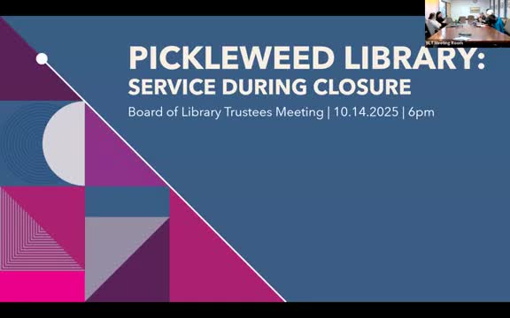 Library staff detailed closure logistics for the Pickleweed branch, relocation of collections to storage, interim pickup and limited services at a nearby community site, a contractor selection, and an expected reopening window in spring–summer 2026.