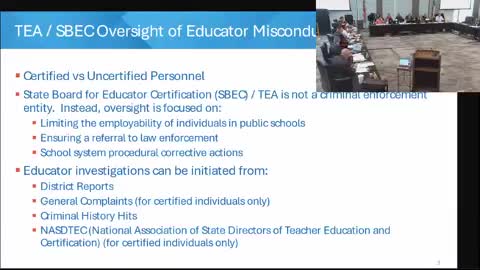 Morath, speaking during the committee of the full board, emphasized a legal bifurcation that matters for how allegations are handled: certified educators fall under the State Board for Educator Certification (SBEC) and TEA enforcement processes; non‑certified employees (including many bus drivers, custodial staff and an increasing share of first‑year classroom hires) are not subject to SBEC’s full disciplinary authority. “There’s SBEC that oversees all certified personnel in the state of Texas and then there’s non‑certified employees who are not under the oversight of SBEC,” Morath said. He described the practical consequence: non‑certified employees are not automatically removable from statewide employment lists unless narrow statutory triggers are met (for example, convictions that fall within specific “do‑not‑employ” criteria).