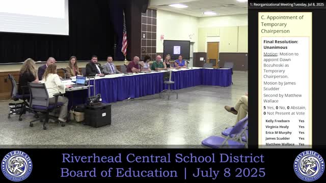 The Riverhead Central School District Board of Education appointed Dr. Julio Gonzales to a vacant seat, elected James Scudder president and Erica Murphy vice president, and swore in a student representative and district officials during its reorganizational meeting; all motions reported as approved by voice vote.