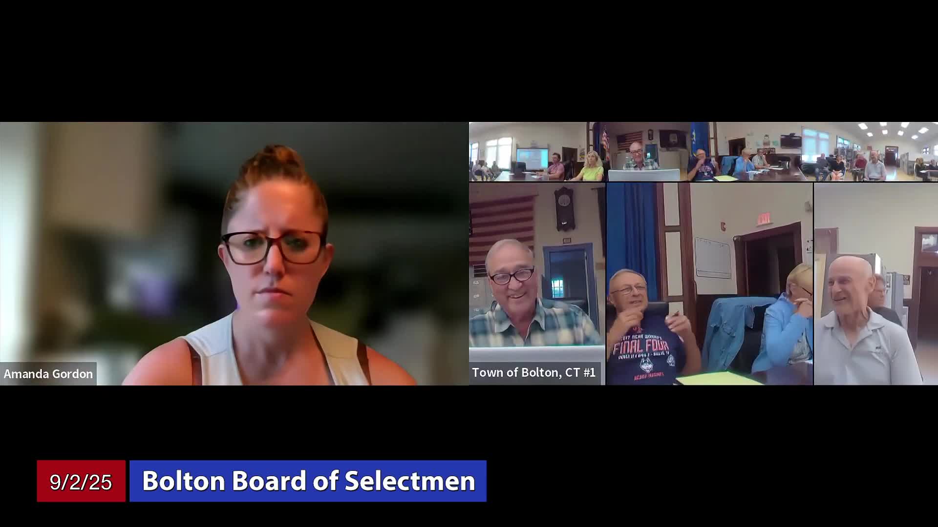 Residents at the Sept. 2 Bolton Board of Selectmen meeting urged the town and state to address traffic and signage problems near Bolton Notch State Park and the Route 6/44/384 interchange, and several asked the town to seek automated speed‑enforcement cameras. Ronald Carboni, who lives at 15 Branch Mountain Road Extension, said grass and brush along the Hot River Trail and the Greenway need trimming and that the parking‑lot signage at the Bolton Notch entrance does not give drivers sufficient warning of a sharp turn. “There was no signage before the entrance to the road to inform drivers of that turn,” Carboni told the board, and he asked staff to determine who is responsible for maintenance along the corridor. Separately, resident Ron Boatman described what he called habitual high speeds at the junction of Route 6, Route 44 and Interstate 384 and formally urged the town to pursue a traffic camera. Boatman cited national research and said, “Traffic monitoring systems have successfully reduced speeding and incidences in many towns and cities across The United States.” He said the town previously submitted a plan to the Connecticut Department of Transportation five years ago and that larger reconstruction efforts remain in state hands. Resident Yolanda Faulkner said DOT staff told her that only a municipal official can apply for an automated enforcement program; she reported DOT pointed to James Rupert as that official. Selectmen responded that they would discuss the camera proposal with Rupert and consider placing the item on a future agenda. A town official told residents the state is working through regional planning and that a full engineering and construction solution for an interstate intersection could take multiple years. Board members asked staff to log the comments and to consult DOT and regional planning partners about short‑term signage fixes and long‑range design alternatives. No formal action was taken at the meeting to request cameras or to change DOT signage.
