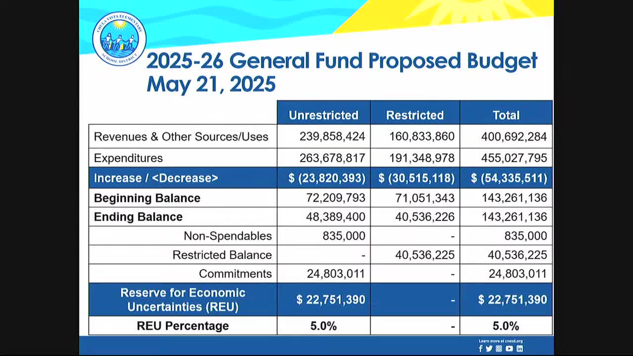 The Chula Vista Elementary School District Board of Education voted unanimously to adopt the district—s 2025—26 proposed budget and the Local Control and Accountability Plan (LCAP), and directed staff to prepare a larger set of budget reductions to protect the district—s multi-year reserves.