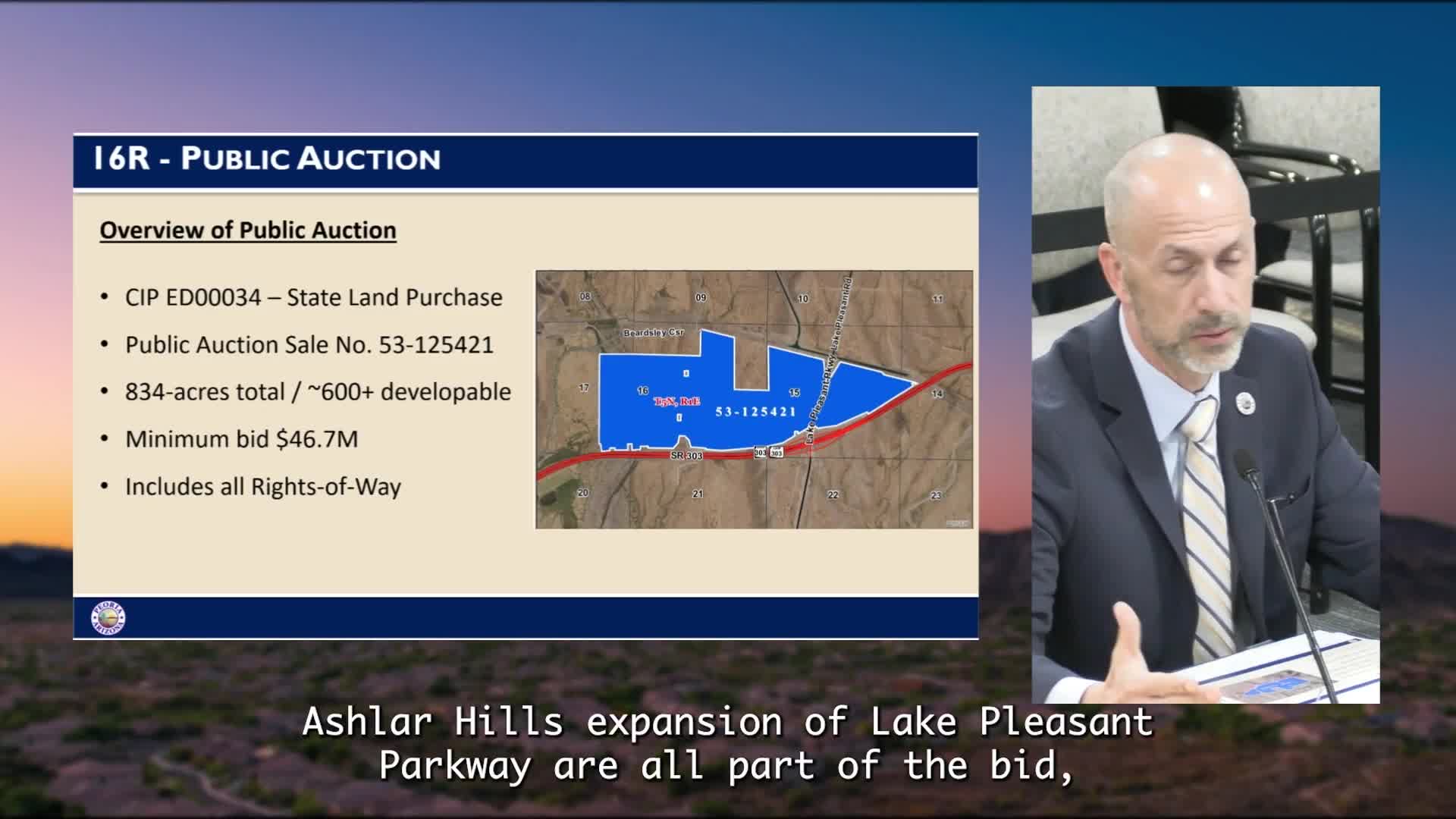 The meeting record shows the city began the application process in December, the planning agreement was executed in March, and an appraisal review board met June 13; the public notice period ended Aug. 22. Staff emphasized that the auction process is governed by the Arizona State Constitution and Arizona Revised Statutes and that the city must follow state procedures and the terms of the participation agreement if it becomes the winning bidder.