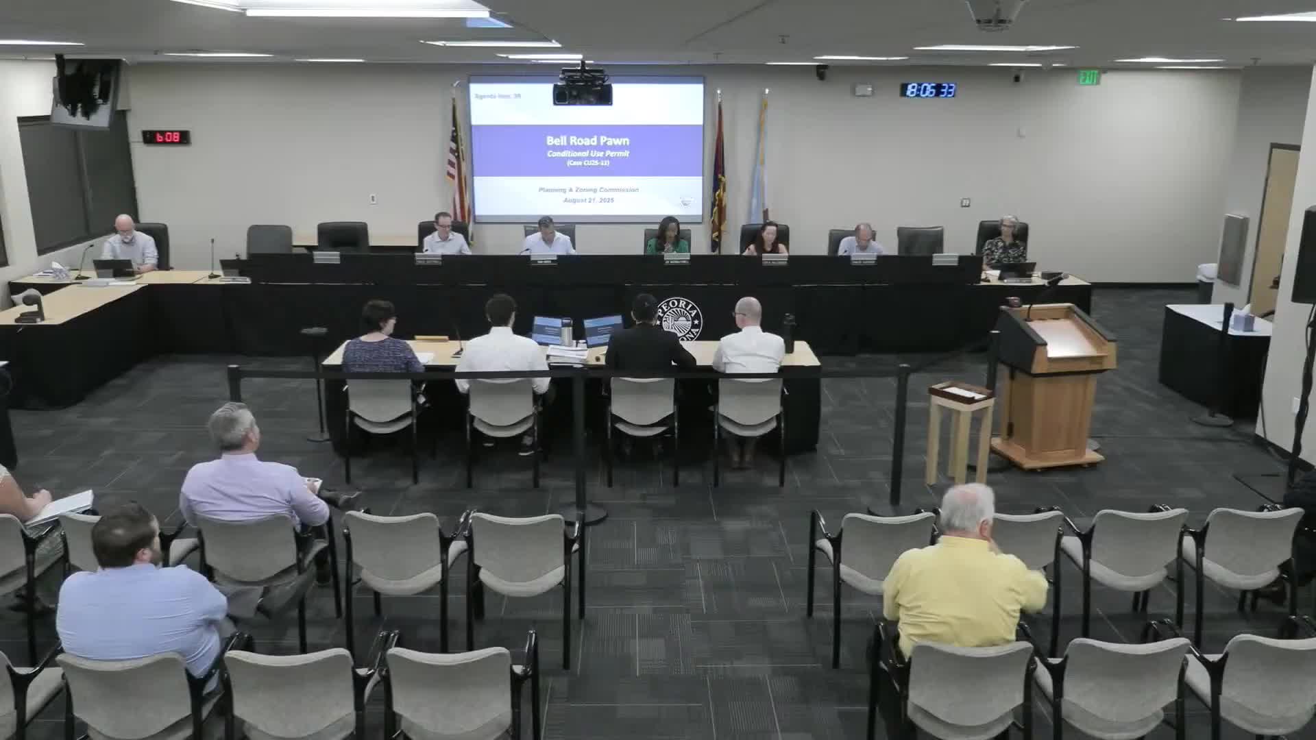 The City of Peoria Planning and Zoning Commission on Aug. 21 approved a conditional use permit for Bell Road Pawn (CU25‑11), allowing a roughly 1,550‑square‑foot tenant improvement in a multi‑tenant building at the northeast corner of Bell Road and 80th Avenue, subject to the conditions in Exhibit 1 and a stipulation that the applicant submit a report within 12 months of opening showing the business is in good standing with city and state authorities.