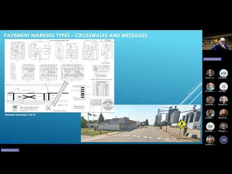 The session also covered dimensional guidance and safety rationale: the department has adopted 6‑inch lane lines and 12‑inch channelization lines on roads with speeds greater than 40 mph; Lyle said, “60 percent of fatal accidents are lane departures, so it’s a good idea anyways.” Inspectors were reminded to follow standard drawings for crosswalk layout (D76201) and to check maintenance agreements for rural crosswalk responsibility before ordering re‑striping.