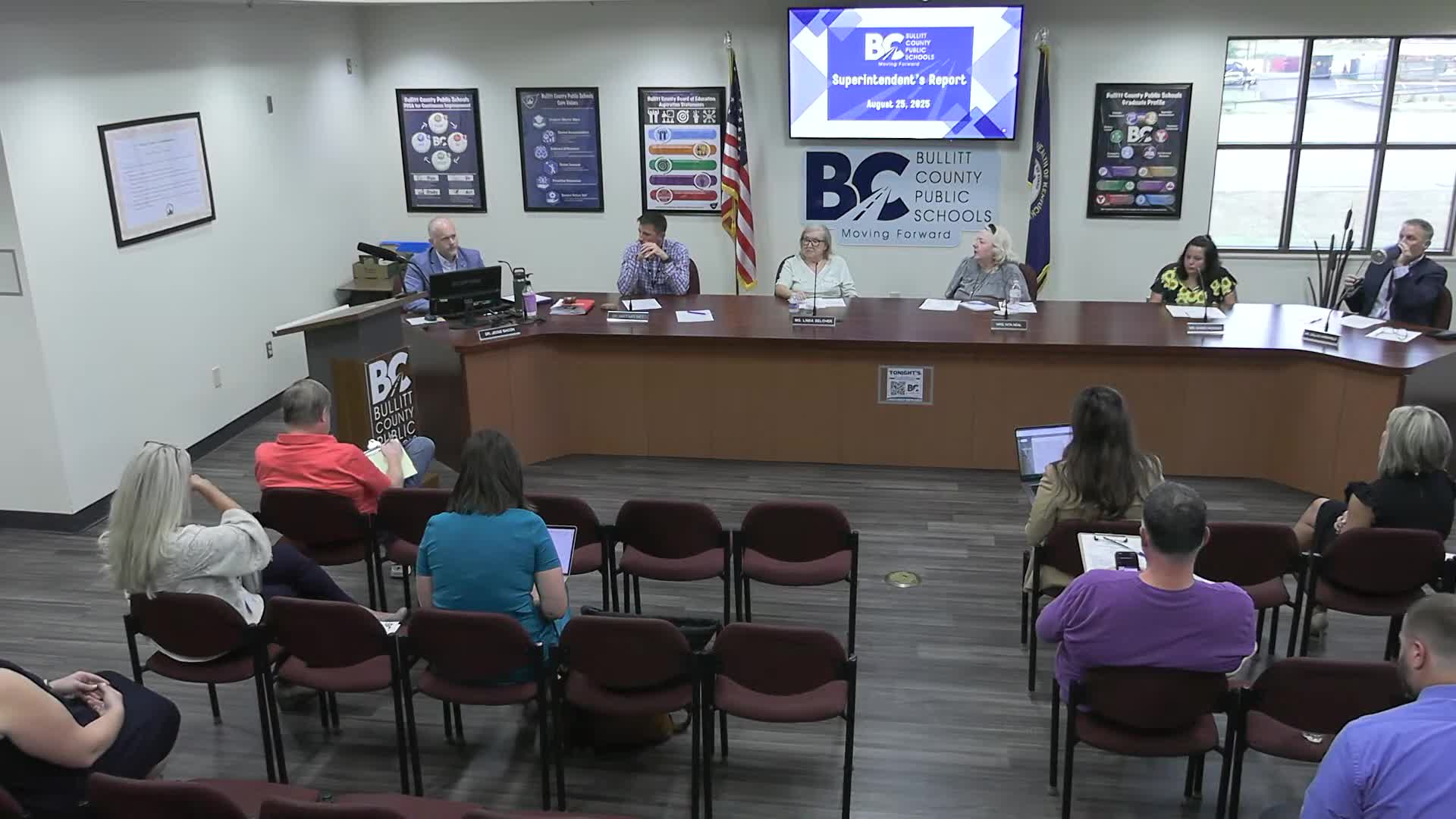 Superintendent Dr. Bacon told the Bullitt County Board of Education the district’s 2025–26 enrollment is a rolling total and currently up roughly 228 students from the end of last year, and that officials are monitoring 10-day counts for final staffing adjustments. He also described a one-day cancellation after a Mount Washington area water main break that affected seven East End schools.