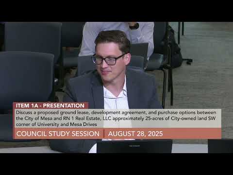 Mesa City Council received a presentation Aug. 28 on proposed ground-lease and development agreements with Cul de Sac for the 19.14-acre Site 17 near University and Mesa Drive. City staff said the package uses a lease-with-options structure intended to phase development and protect city interests until public improvements are complete.