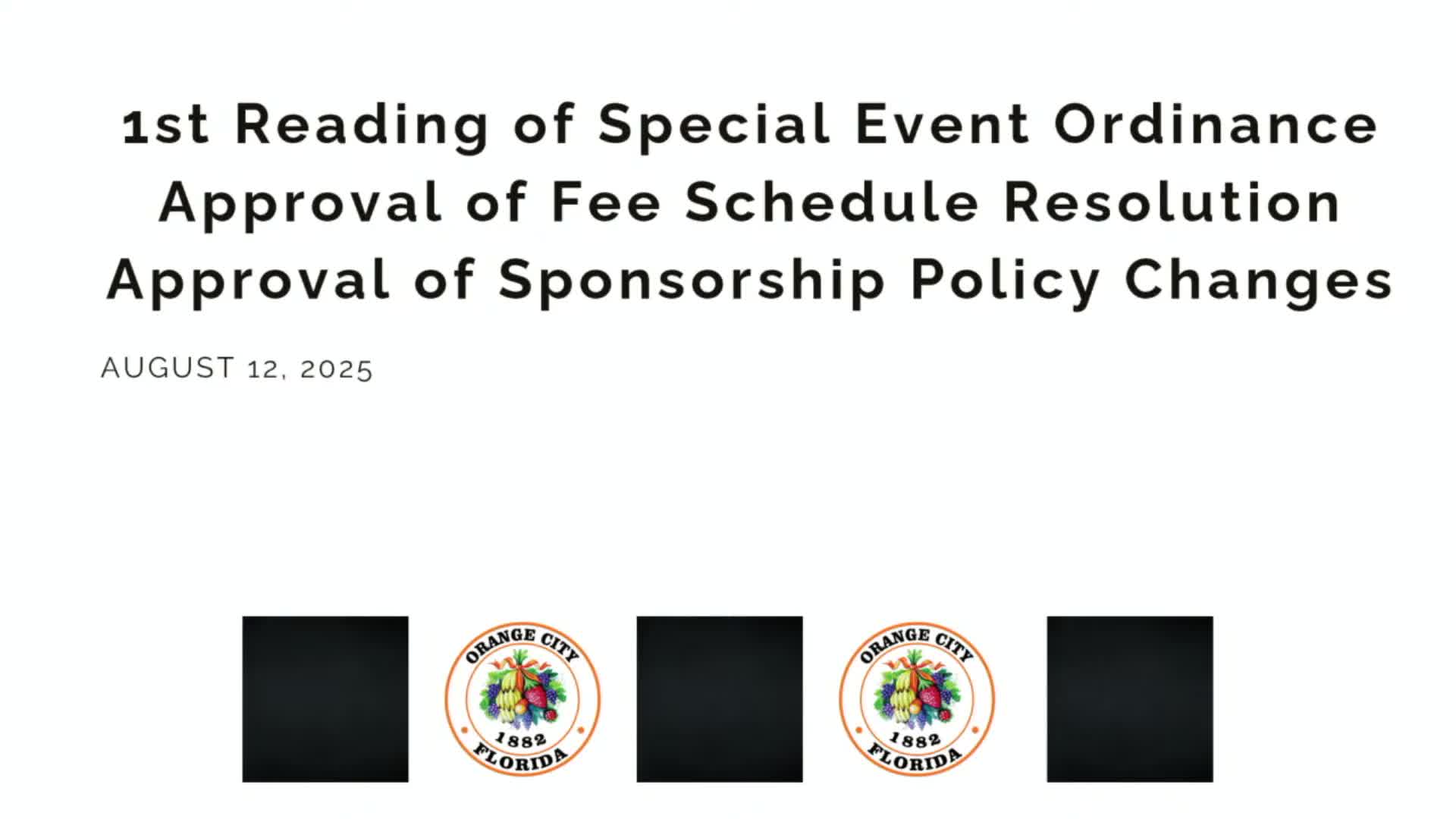 Orange City Council on Aug. 12 approved changes to the city's sponsorship policy, voted to adopt a special‑events ordinance at first reading and approved a resolution creating a uniform in‑kind fee schedule for city‑sponsored events. The action moves the special‑events ordinance to a second and final reading to be scheduled for Aug. 26, 2025.