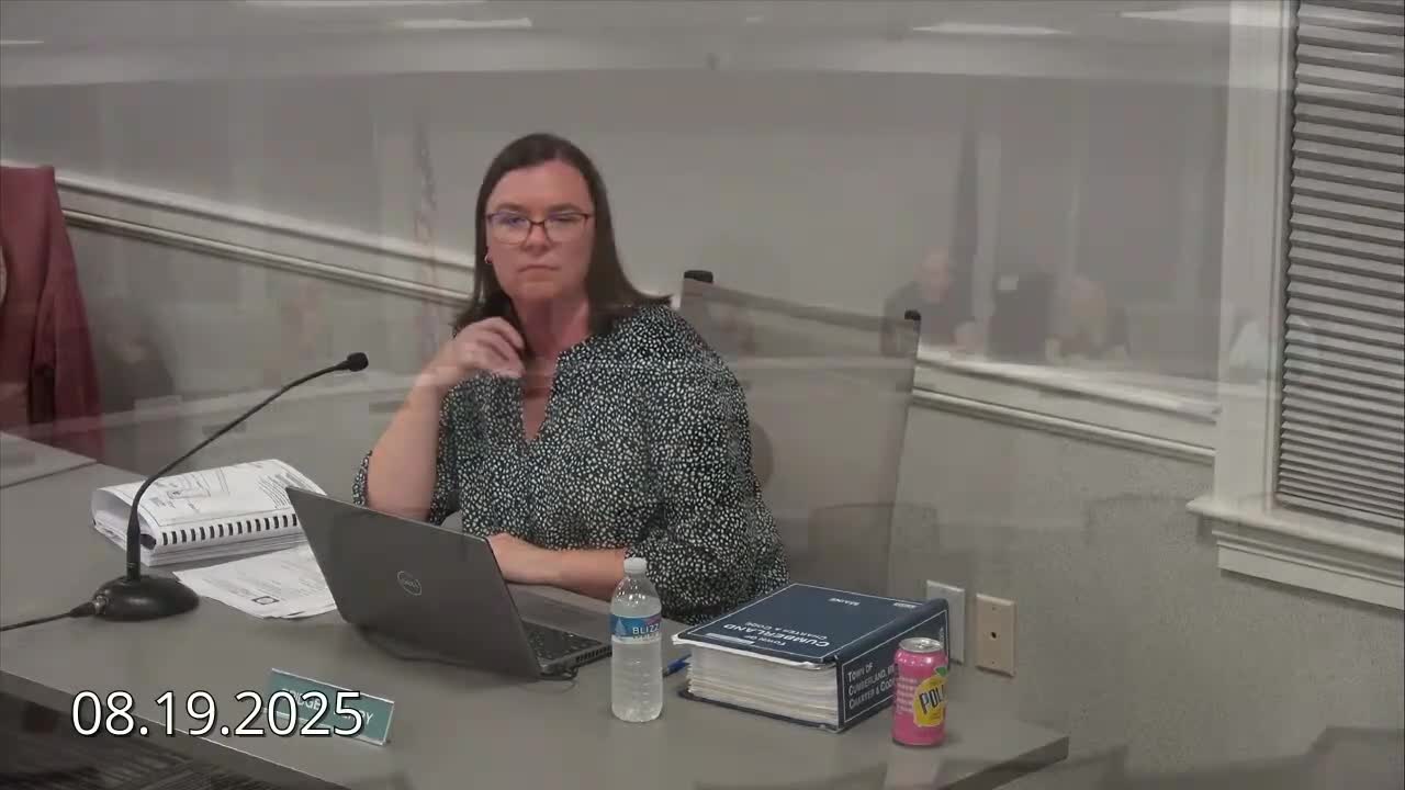 The Cumberland Planning Board voted to approve a site plan for a 140-foot telecommunications monopole at 14 Tuttle Road on Aug. 19, subject to standard conditions and nine project-specific conditions, after hearing technical presentations and public comment. The applicant team represented Verizon Wireless and tower owner Vertical Bridge; the town will also place public-safety communications equipment on the structure.
