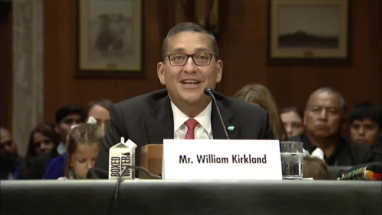 At a Senate Committee on Indian Affairs hearing, William "Billy" Kirkland, the president's nominee for Assistant Secretary for Indian Affairs, described his upbringing, cited prior White House work with tribal issues and said he would work with tribes and the committee to uphold federal trust responsibilities if confirmed.