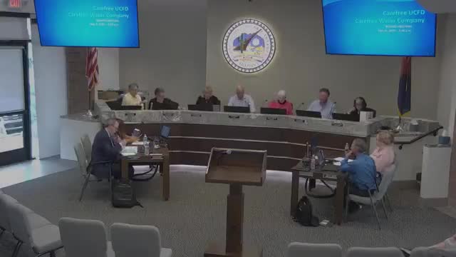 Greg Crossman, the staff presenter, walked the board through an organizational chart showing a legal separation between the town of Carefree and the water enterprise, and said the UCFD holds long‑term debt while the Carefree Water Company raises operating revenue. "We hold the water rights for the benefit of the town," Crossman said, and explained the company imports Colorado River water via the CAP Canal, uses a treat‑and‑transport agreement with Scottsdale and supplements supply with pumped groundwater.