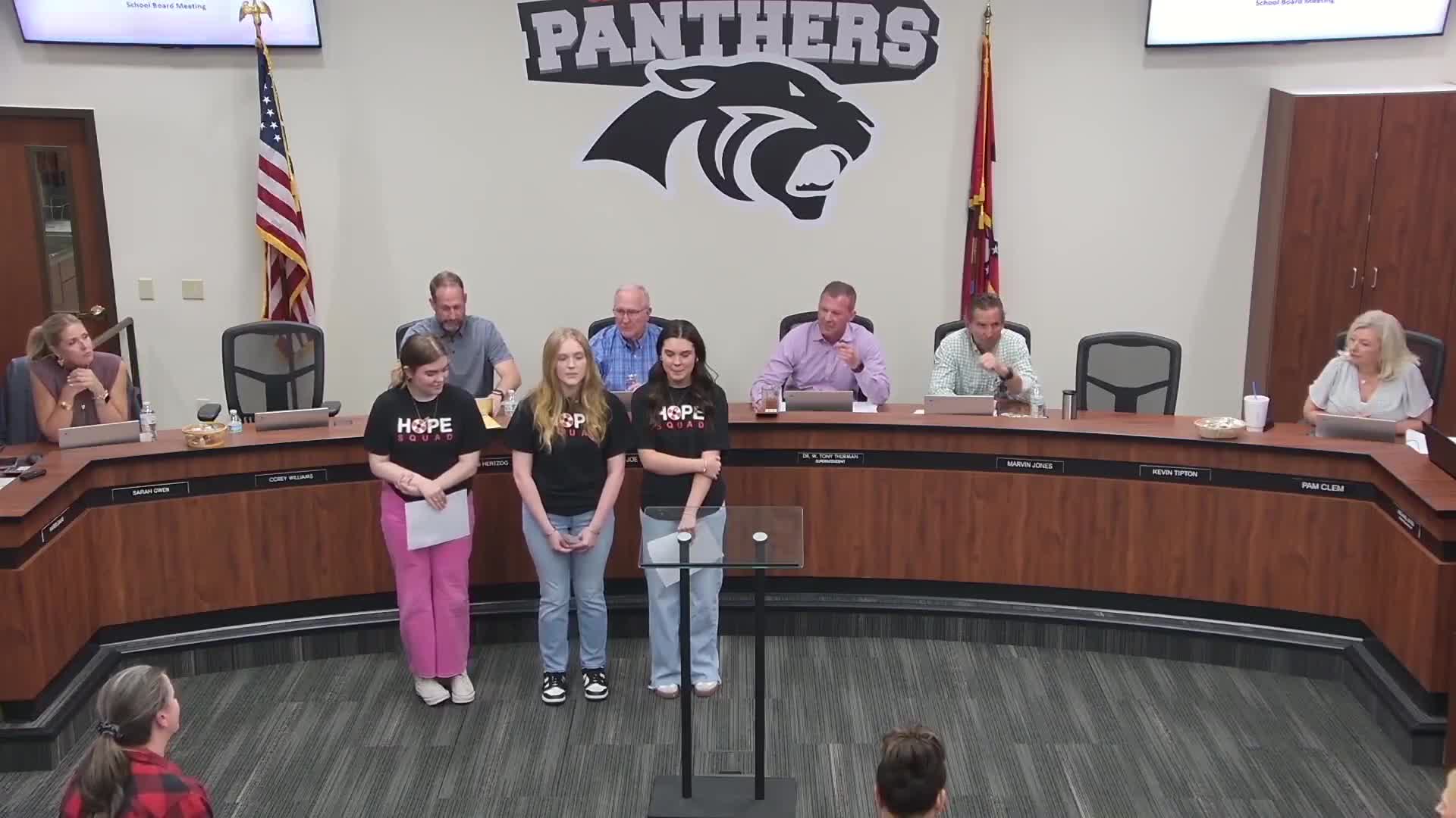 Rebecca Jordan, another Hope Squad senior, described the group’s training: she said peer members receive roughly 25 hours of initial training and 7–9 hours per year of follow‑up, drawn from curricula that include Talk Saves Lives and Hope’s Law. Jordan told the board that from 2022 through 2024 the high school team reached “over 700 students” in school programming and that a 2024 panel discussion reached more than 300 students.