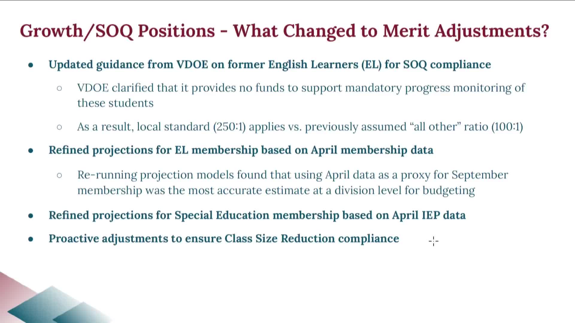 Staff presented a staffing reallocation for FY26 that moves personnel within the board‑approved budget rather than increasing the total number of funded positions. Using late‑April enrollment and updated state guidance on English‑learner (EL) funding and monitoring rules, staff said they reduced the previously proposed 8.5 ESOL positions because many students reached “former EL” proficiency levels and because the state clarified how proficiency affects funding and staffing expectations.