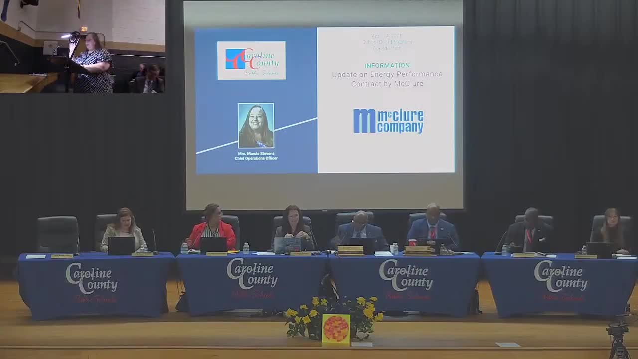 Representatives from McClure updated the Caroline County School Board on an energy‑performance contract that includes building efficiency work completed in phase 1 and a proposed solar power purchase agreement (PPA) to capture additional savings.